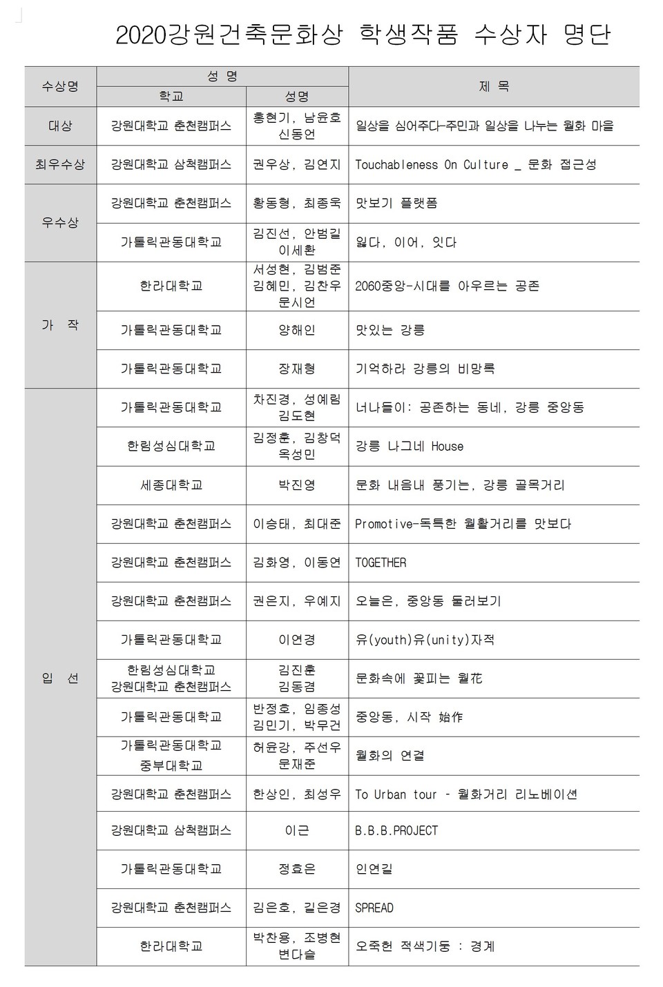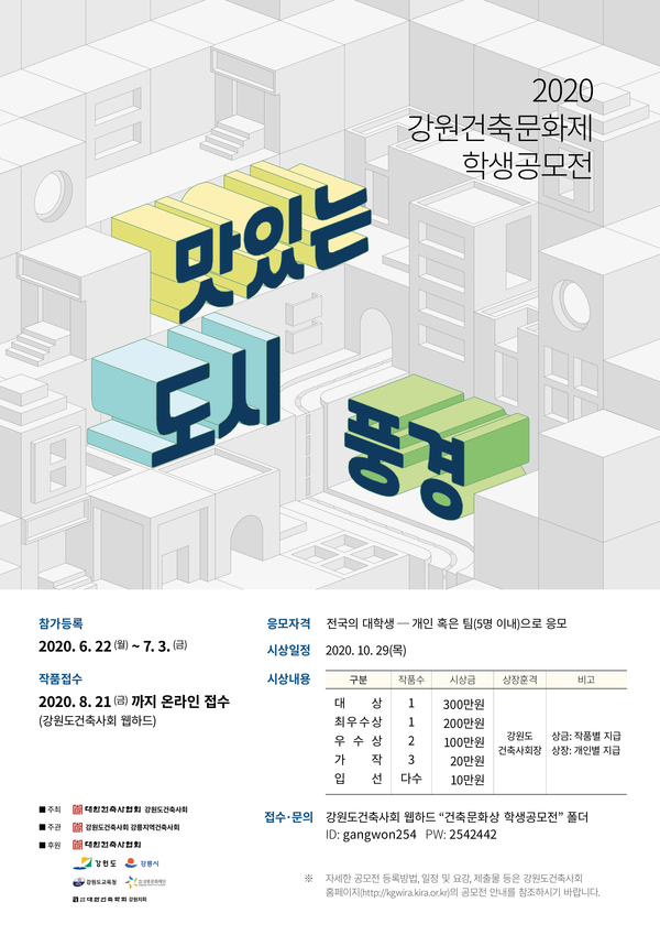2020 강원건축문화제 학생공모전은 건축과 도시는 누구에게나 편안하고 쉽고 익숙하게 제공되어야하며 그 안과 밖을 함께 즐길 수 있는 대상으로 각각의 삶과 함께 변화하고 진화한다는 의미로 “맛있는 도시풍경”으로 주제를 정하고, 전국의 대학생 및 개인의 우수한 작품을 공모하였고, 8월 31일(월)에 심사결과에 대하여 수상자를 발표하였다.