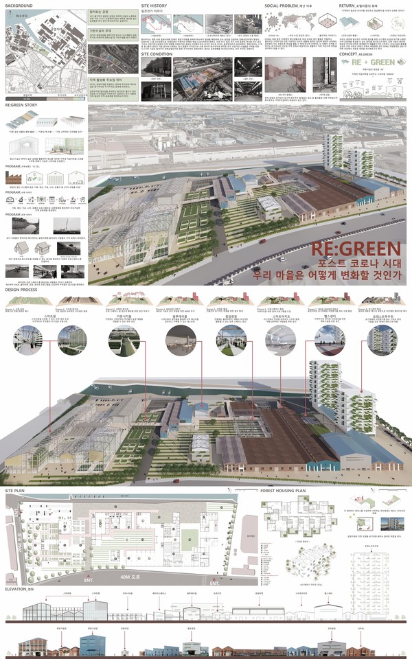 대상 수상자인 인하공업전문대학 팀은 작품설명에서, ‘RE:GREEN’은 “인천은 바다에 면해 있지만 공장과 군사시설로 막혀있어 자유롭게 접근 가능하지 않다. ...... 시민에게 열린 공간으로 돌려주기 위해서는 주거지역과의 경제에 위치한 ...... 방대한 공장부지에 생산성을 부여하고 새로운 주민과 일자리로 활기를 불러 일으키면서 지역주민이 교류할 수 있게 하여 ......(중략) 지역 공동체를 형성하고자 한다”라고 하면서, 방치되어 있는 공장에 식자재 생산 시스템(스마트팜)을 도입하고 기획, 생산, 가공, 소비, 유통의 5가지 과정을 도입하는 방법으로 지역 공동체가 활성화 되고 교류할 수 있는 방법을 제시하였다.