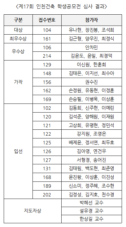 제22회 2020 인천건축문화제 조직위원회(위원장 전호열)는 2020년 9월 15일(화) 제17회 인천건축학생공모전 심사 결과를 발표하였다. 이번 학생공모전은 ‘인천 지역의 기존 건물에 대한 재생, 골목길, 광장 같은 도시적 회복이나 빈집, 버려진 공간을 활용한 지역적 커뮤니티의 계획 등 모든 방법으로의 제안’을 “회복(이 시대 로컬리즘의 발견)”으로 보고 지역적 특색을 어떻게 활용하고 수정・개량했는지에 주안점을 두었다.