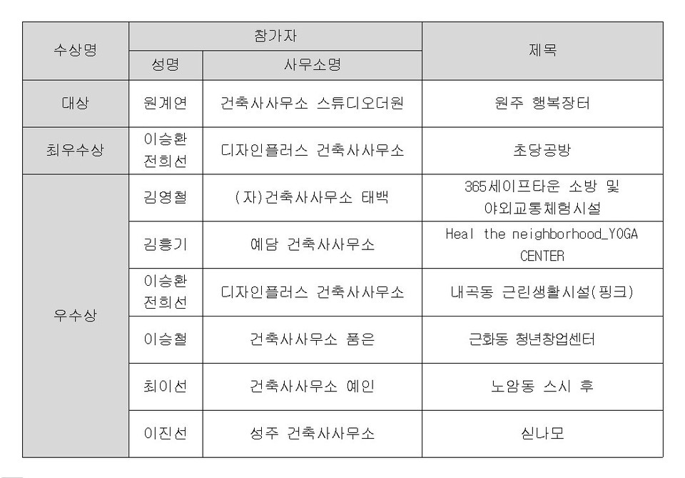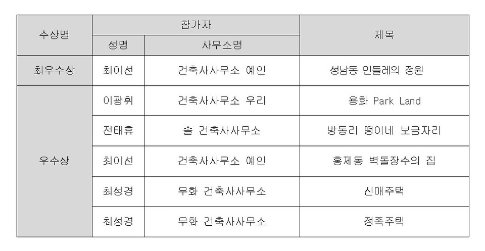 최우수작은 주거부문에서 건축사사무소 예인(최이선 건축사)의 ‘성남동 민들레의 정원’이 선정됐고, 비주거부분에서 디자인플러스 건축사사무소(이승환,전희선건축사)의 ‘초당공방’이 선정됐다.