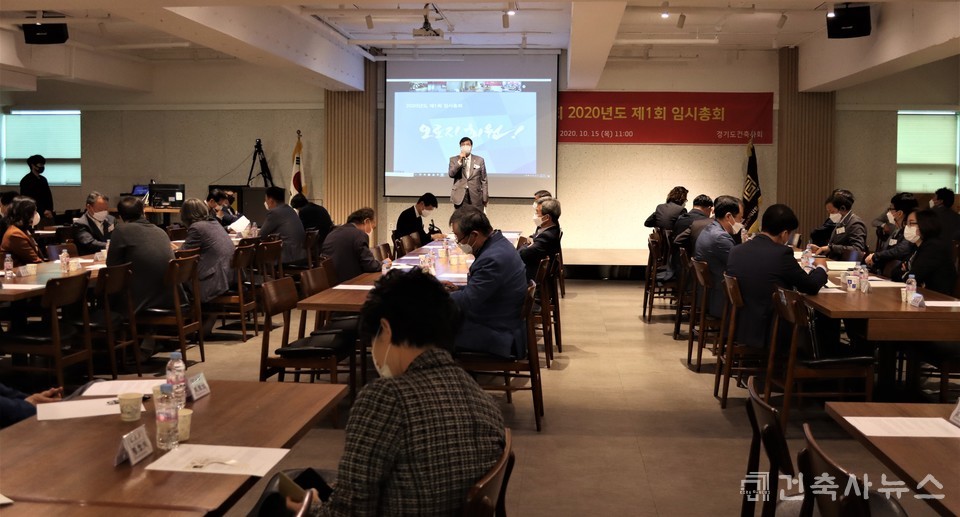 대한건축사협회는 10월 15일 건축사협회 의무가입 사전조치 이행을 위한 정관 등 규정 개정을 위하여 ‘2020년도 제1회 임시총회’를 개최했다. 이번 임시총회는 대의원이 소속 시도건축사회 회의장(실)에 출석하여 본 협회와 시도건축사회 회의장간 화상회의 방식으로 개최되었다. 경기도건축사회 대의원들도 수원소재 마련된 장소(더아리엘)에서 본협에서 진행되는 회의를 참관하였다.