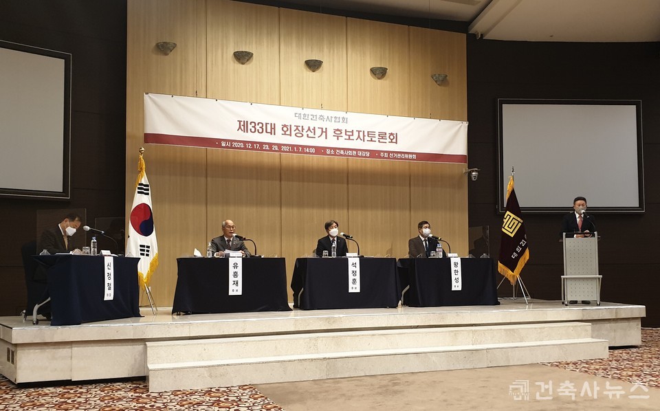 대한건축사협회는 12월 17일 제33대 회장선거 1차 후보자토론회를 대한건축사협회 대강당에서 개최했다. 선거관리위원회는 코로나 19 여파로 전국 4개 지역에서 실시하려고 했던 토론회 전회를 유튜브 실시간 중계로 진행한다고 밝혔다. 이에 사회적 거리두기 2.5단계 방역지침에 따라 최소한의 인원만 참석해 개최됐다. 12월 23일, 29일, 1월 7일 나머지 토론회 역시 온라인으로 진행할 예정이다.