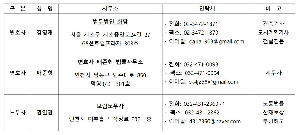 인천광역시건축사회(회장 김장섭)는 지난 5월 28일(금) 김영재 변호사, 배준형 변호사 겸 세무사, 권일권 노무사를 외부 전문가 자문위원으로 위촉하였다.