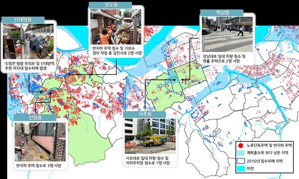 시간당 100mm 이상 강우 발생 지역, 과거 침수피해 지역, 노후단독 및 반지하 주택 밀집지역, 주요 하천변 저지대 등에서 인명 및 재산피해가 가중되는 등 재해의 위해성, 노출성, 취약성이 공통적으로 높은 지역에 피해가 집중되었다는 분석이다.