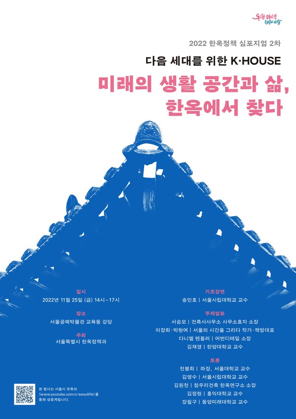 한옥을 고쳐 사는 건축주, 한옥에 관심 많은 젊은 건축가와 시민이 한자리에 모여 K-하우스 '한옥'의 가치를 공유하는 자리가 마련되었다. 서울시는 「미래의 생활공간과 삶, 한옥에서 찾다」를 주제로 25일 서울공예박물관 교육동 강당에서 「2022년 제2차 한옥정책 심포지엄」을 개최했다.