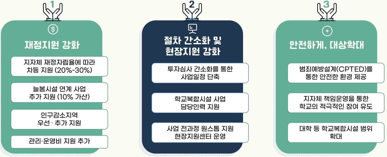 또한 교육부 중앙투자심사 면제 등 행정절차 간소화 및 학교복합시설 관련 업무의 부담 해소를 위한 인력지원도 병행한다고 밝혔다. 모든 학교복합시설에 범죄예방환경설계를 적용하여 학생과 주민을 시간적·공간적으로 분리하고, 지자체 협업을 통한 원격통합관제시스템 등을 활용하여 학생들의 안전을 최우선으로 고려하겠다는 계획이다.