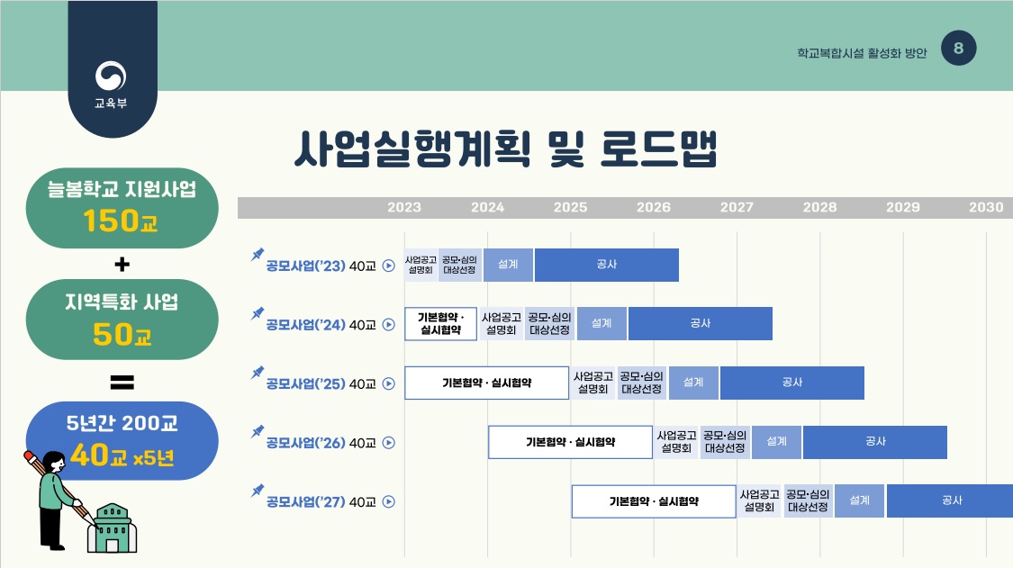 - 5년간(2023~2027) 매년 40개교씩 총 200개교 학교복합시설 공모‧선정