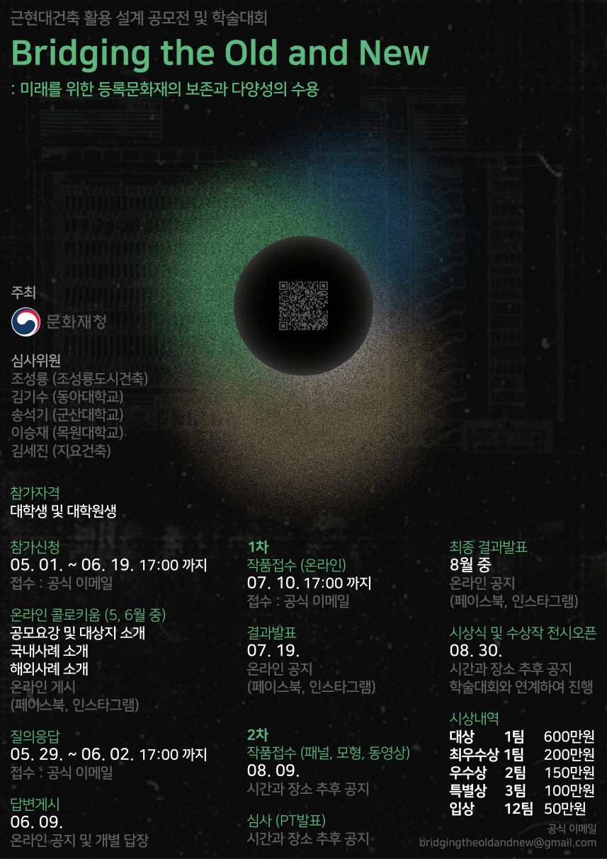 문화재청이 주최하고 목원대학교 산학협력단이 주관하는 이번 설계공모는 근현대건축유산의 가치를 유지하면서 지역공동체 속에서 공존할 수 있는 새로운 관점의 보존방안 마련을 위해 “미래를 위한 국가등록문화재의 보존과 다양성의 수용”이라는 주제로 진행된다.