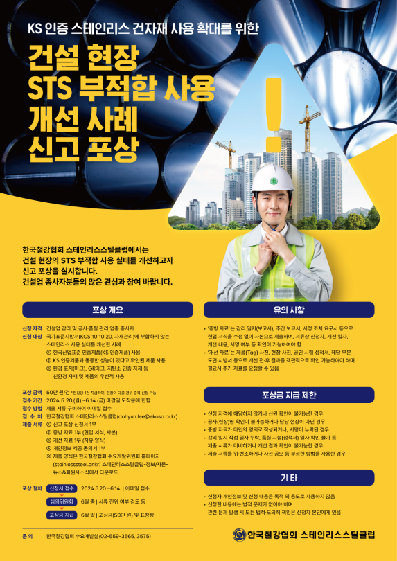 한국철강협회 스테인리스스틸클럽에서는 KS 인증 스테인리스 건자재의 올바른 현장 적용을 위한 ‘건설현장 STS 부적합 사용 개선사례 신고포상’을 실시하고, 오는 6월 14일까지 포상 신청서를 접수한다고 밝혔다.