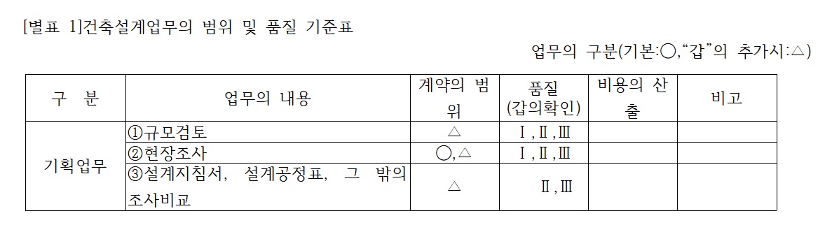 2.3."기획업무"라 함은 건축물의 규모검토, 현장조사, 설계지침 등 건축설계 발주에 필요하여 건축주가 사전에 요구하는 설계업무를 말한다.
