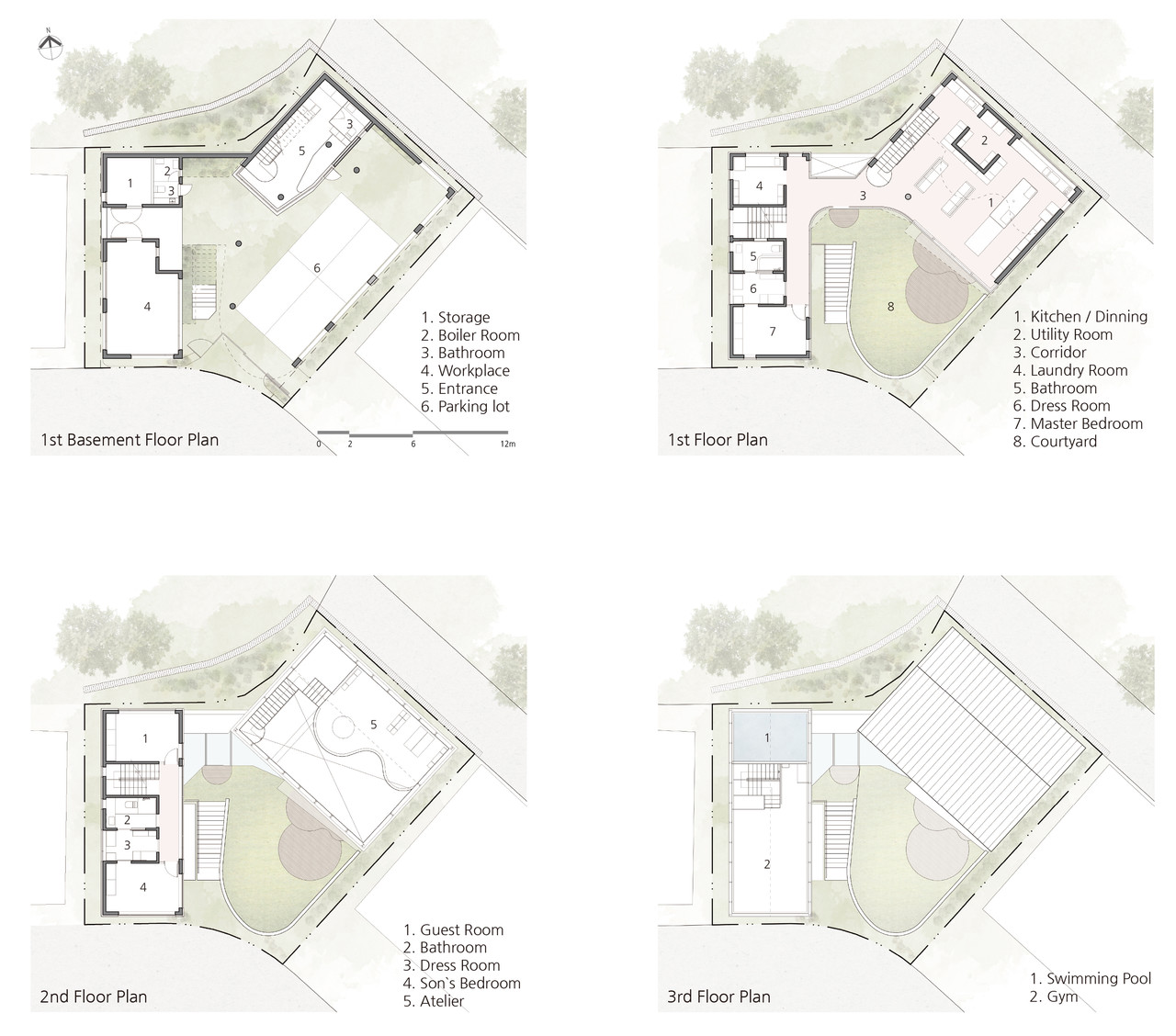 흘러내려오는 자연의 구릉을 건물 장벽으로써 차단하지 않고, 주택의 정원과 단지 내부로 자연스럽게 연결시키는 계획안