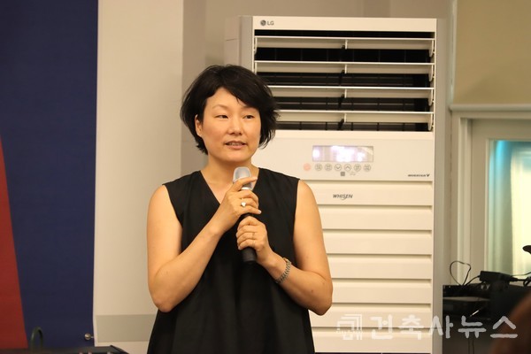 김나리 대표는 광교 갤러리아 백화점, 대신증권 사옥, 송도 트리플 스트리트 등 비롯한 파사드 디자인 컨설트 사례를 통해 성능 유지와 디자인 구현을 위해 솔루션을 찾는 과정을 설명했다.