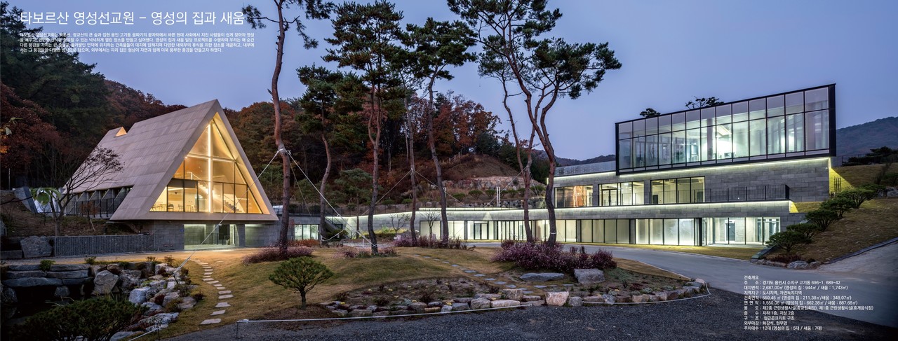 타보르산영성선교회는 백운산, 광교산의 큰 숲과 접한 용인 고기동 골짜기의 끝자락에서 바쁜 현대 사회에서 지친 사람들이 쉽게 찾아와 영성을 채우고 편안한 안식을 향유할 수 있는 넉넉하게 열린 장소를 만들고 싶어했다. 영성의 집과 새움 빌딩 프로젝트를 수행하며 우리는 매순간 다른 풍경을 가지는 큰 숲들로 둘러싸인 언덕에 위치하는 건축물들이 대지에 앉혀지며 다양한 내외부의 휴식을 위한 장소를 제공하고, 내부에서는 그 푸역ㅇ들을 다양한 방식으로 담으며 외부에서는 자리잡은 형상이 자연과 함께 더욱 풍부한 풍경을 만들고자 했다.