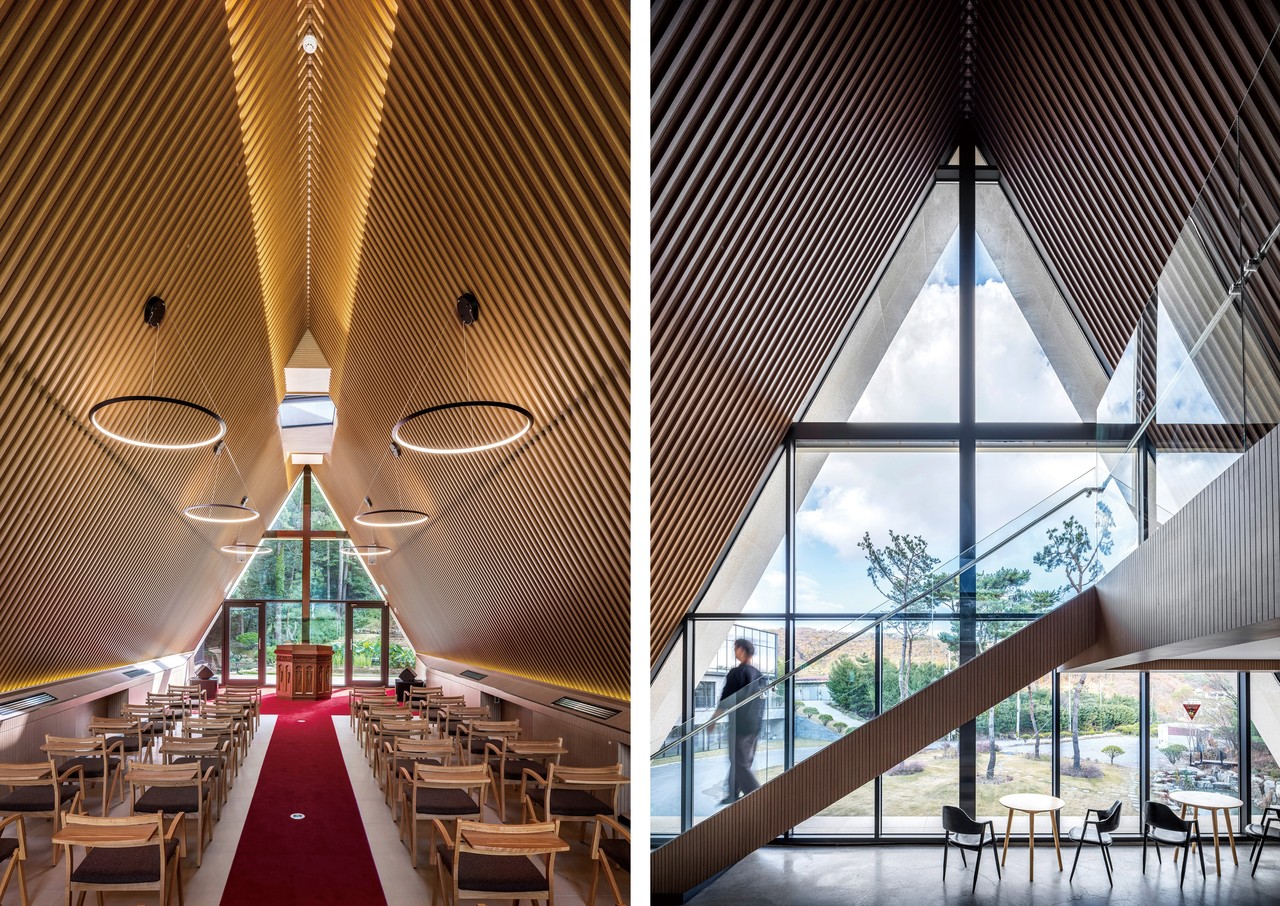 2층 예배당은 예배시 삼각형 조형의 특성으로 음이 반사하여 울릴 것을 고려하여 전체 벽을 목재 흡음패널로 구성했으며, 흡음패널의 세로형 그릴에 같은 폭의 목재를 추가로 부착하여 흡음성능을 높일뿐만 아니라 삼각형 공간의 흐름을 더욱 강조하여 전후변의 열린 창과 함께 특별한 공간감을 가질 수 있도록 의도했다. 예배당에 필요한 냉난방 및 전기통신 설비는 측면에 성경, 찬송가집 등의 책을 보관하며, 필요에 따라 개인적으로 기도할 수 있는 가구에 일체화하여 예배당에서 드러나지 않도록 계획하였다. 또한 1층의 기도실 각 실에서는 남측으로 크게 열린 창과 함께 이를 둘러싸는 벽, 후면부 골짜기의 물으 받아 흘리는 수경시설로 다양한 풍경을 가지는 밀도 있는 공간을 구성하였으며, 사무실 상부의 테라스는 자연스럽게 새움빌딩으로 연결된다.