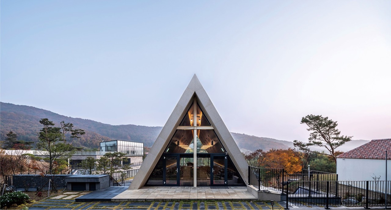 건물은 최대한의 층고와 공간감을 제공하면서도 주변의 환경에는 최소한으로 영향을 주는 방식으로 상부로 갈수록 좁아지는 삼각형의 형상으로 계획하였다. 특히 내부공간에서 필요한 공간을 위해 1층 기도실과 복도에서부터 시작되며, 1층 기도실 옆에 소회합에서 북측의 풍경과 함께 상부 예배당으로 열린공간을 가지도록 구성했다. 1층에서부터 크게 기울어진 벽체를 만들기 위해서 공사과정에서 비계역할을 하며, 커튼월의 구조로 역할하는 십자형의 철골을 양끝에 두어 자연스럽게 종교시설서의 정체성을 드러내고자 했다.