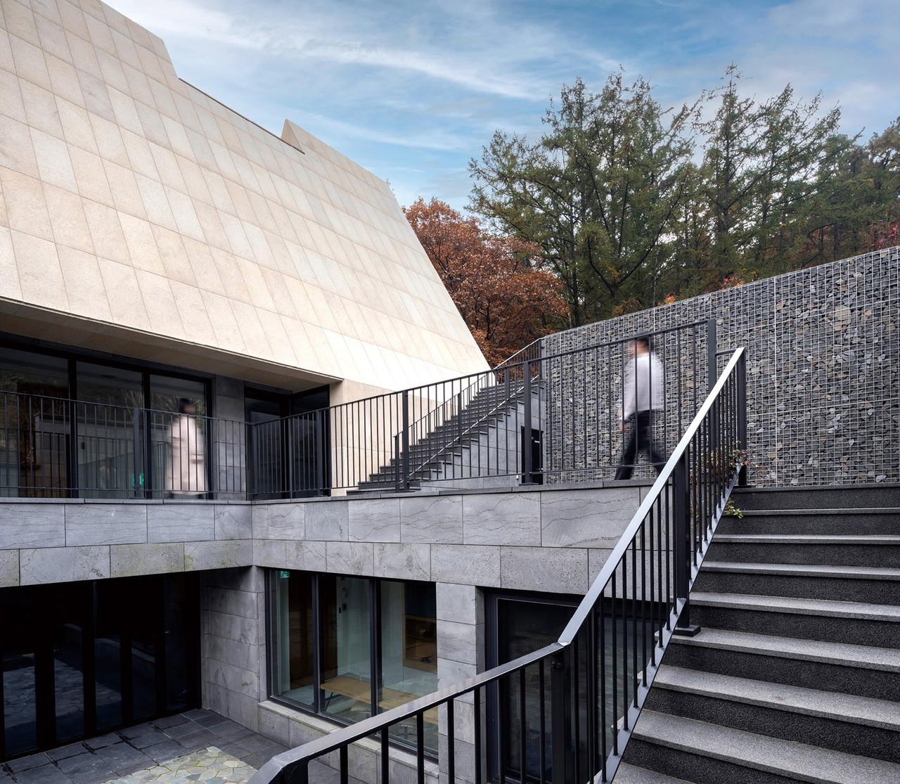 이를 위해, 지하 1층과 1층의 체적은 2층 마당의 레벨에 맞추어 풍경을 볼 수 있는 새로운 대지-옥상정원을 구성한다. 많은 부분이 땅에 묻히는 지하 1층과 1층은 현무암으로 외장을 구성하고, 바다까지 최대한으로 열리는 전창을 계획하였으며, 지하 1층 전면부 마당, 1층 테라스 등 외부공간을 연결하여 모든 층에서 남측의 골짜기와 도시로 열린 조망을 누릴 수 있도록 했다.