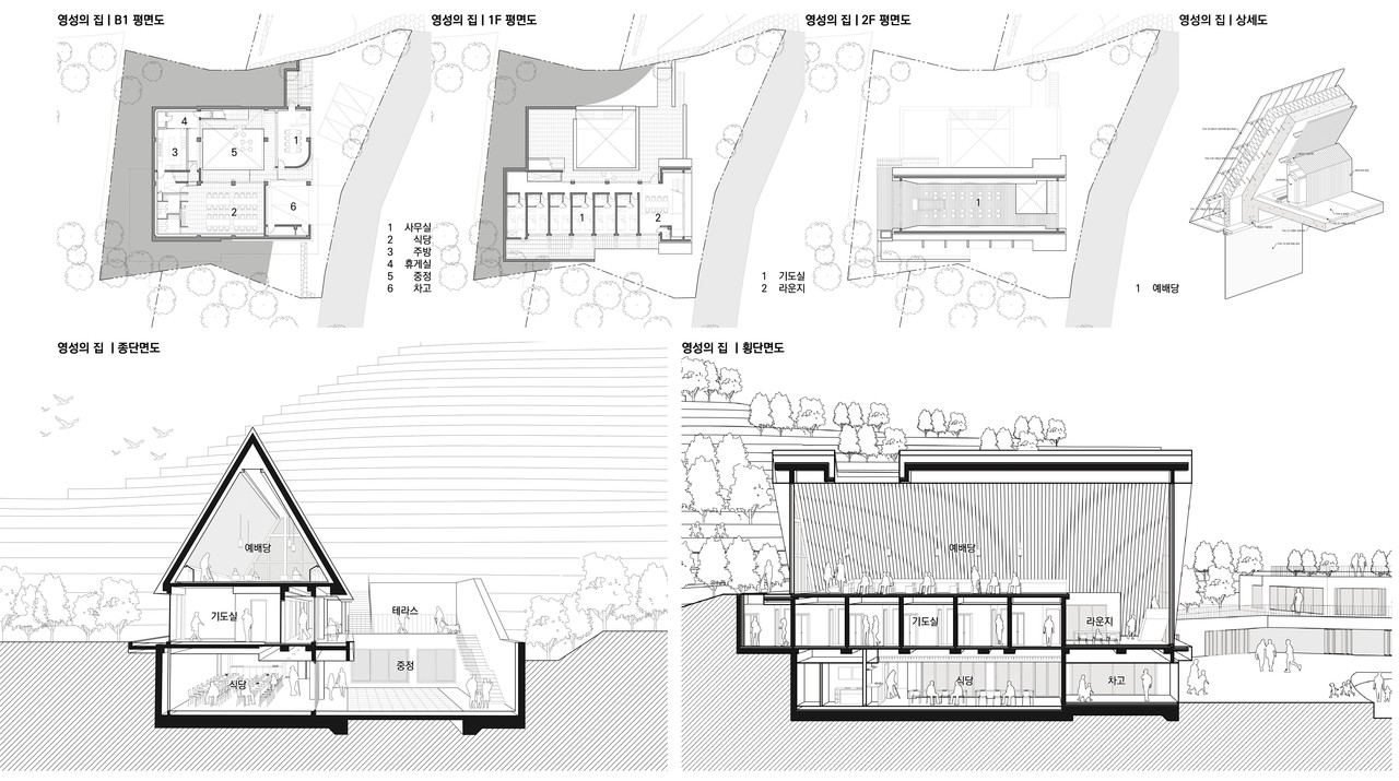 전면도로에서 지상으로 접하며 나머지 부분에서는 땅에 묻히는 지하층에서 집회실, 사무실, 주방 및 소집회실이 중정을 둘러싸는 구성으로 거주를 위한 환경을 구성하며, 다양한 행사를 수용할 수 있도록 했다. 또한 경사지에 놓이는 건물의 특성을 극대화하여 지하 1층의 전면부와 중정뿐만 아니라 1층의 각 기도실에서 나올 수있는 테라스, 회의실에서 연결되는 옥상공간, 2층 예배당에서 연결되는 서측 마당 등 모든 공간에서 직접 연결되는 다양한 외부공간을 배치하여 기도와 회합의 과정에서 다양한 자연과 풍경을 함께 누릴 수 있도록 했다. 지하 1층을 위주로 대지에 접하는 부분은 어두훈 현무함으로 삼각형의 매스를 이루는 부분은 화강으로 외장재를 구성했다.