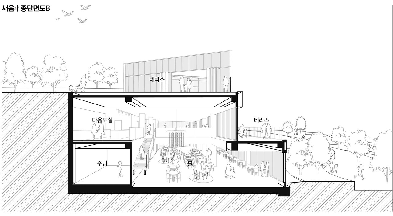 새움빌딩은 이곳을 찾을 사람들이 편하게 다과를 이용할 수 있는 카페와 많은 사람들이 모이는 옥내, 옥외 행사를 수용하기 위한 장소이다. 남측의 주진입로와 열린 마등을 기도의 집과 함께 공유하고, 북측으로는 8~9m의 레벨차를 가지며 고기동 골짜기 아래로 크게 열린 풍경을 가지는 넓은 잔디마당을 가지는 대지의 형상을 고려하여 필요한 면적을 담되, 북측의 높은 마당에서 누릴 수 있는 고기동의 풍경을 가리지 않으며, 크고 작은 외부행사를 넉넉히 수행하는 새로운 땅이 되는 건축을 목표로 하였다.