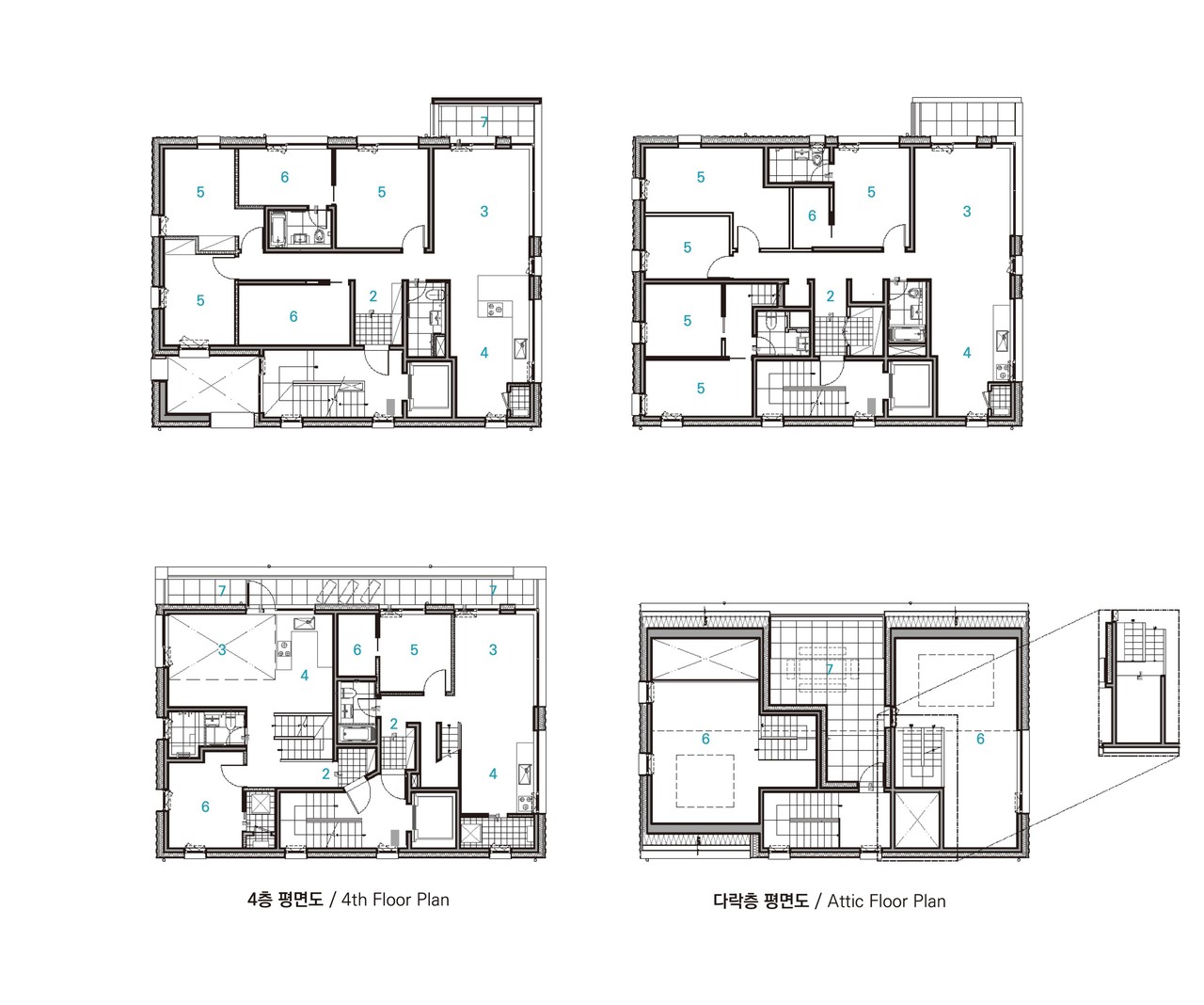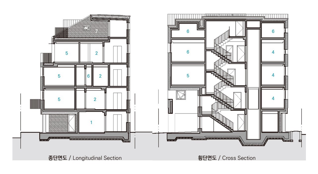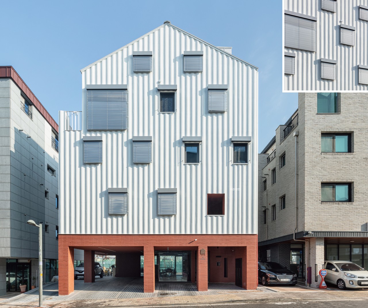 각 가구의 공간구성은 평면과 단면 구성이 일률적이지 않으나, 입면의 통일된 패턴과 창호를 통해 하나의 질서를 갖으며 한 집에 거주하는 가족의 의미를 내포하게 된다. 규칙적인 창호는 각 실의 용도에 맞춰 형성되었고, 곡면 단열재를 활용한 세로 패턴과 더불어 1층의 벽돌타일은 강한 유대감을 드러내며, 가족이라는 굳건한 관계가 대지에 정박하는 의미를 부여하였다.