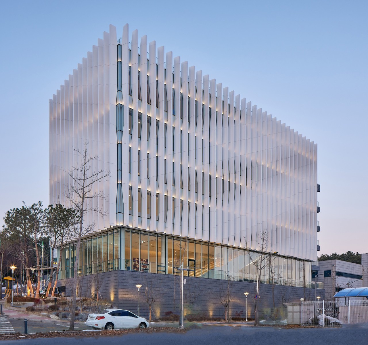 본 루버는 알루미늄 37로 구성되어 있다. 형태가 가진 유선형을 최대한 살리고자 절곡면을 최소화하고자 하였고 이를 위하여 금속재료가 지닌 탄성을 곡면형태로 이용하고자 하였다. 즉 알루미늄이 지닌 탄성을이용해 장방형 패널을 트위스트 시킨후 클립방식으로 고정함으로서 절곡면과 코킹 마감을 최소화할 수 있었다. 이러한 최소화된 절곡면은 효율적인 시공성과 추후 발생할 수 있는 유지관리에 대한 어려움을 해소할수 있다. 즉 이중곡면 형태를 알루미늄 루버가 지닌 탄성을 이용하여 시공함으로서 합리적인 시공성과 동시에 에너지 효율을 극대화하고자 한 것이다.