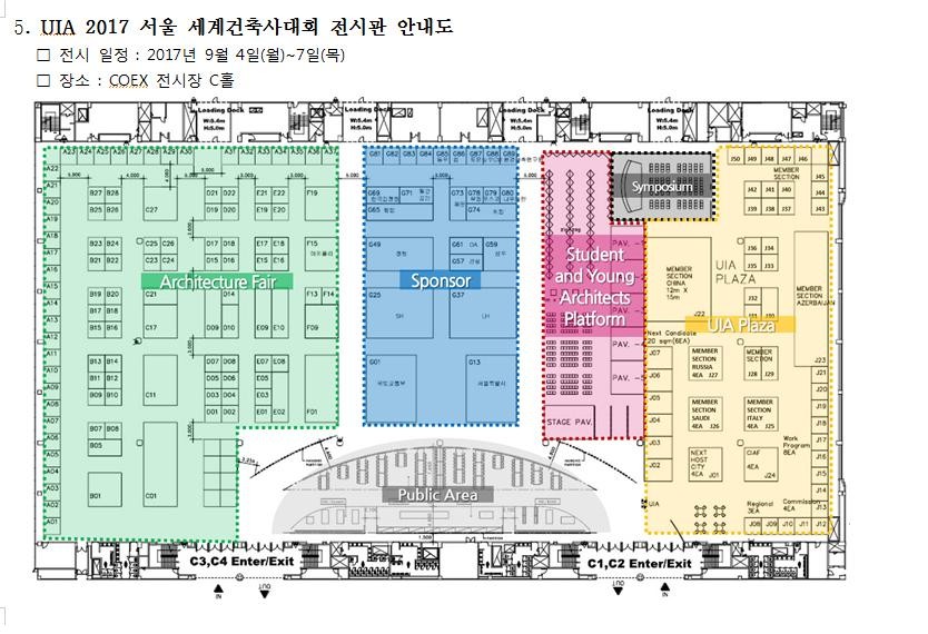 ARCHITECTURE FAIR , SPONSOR, STUDENT AND YOUNG ARCHITECTS LATFORM , UIA PLAZA의 4구역으로 나뉜다.