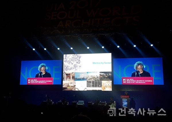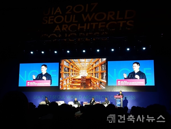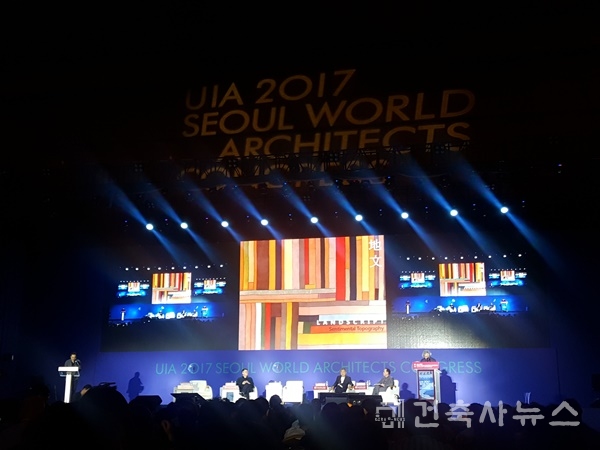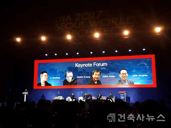지난 4일부터 서울 코엑스에서 ‘UIA 2017 서울세계건축대회’가 열리고 있는 가운데, 이날 5일에는 ‘역사와 함께하는 디자인’이라는 주제로 기조강연이 진행됐다. 리 시아오동 칭화대 건축대 교수, 서울시 초대 총괄건축가 승효상, 구마 켄고, 전봉희 서울대 교수가 강연자로 올랐다. 이날 강연은 동아시아의 현대 건축인들이 오랜 역사와 압도적인 전통의 잔재를 어떻게 인식할 것인지에 대해 담론을 여는 자리로 마련됐다. 승효상 외 초청된 건축가들은 ‘각자 자신의 디자인 실무 속에 역사는 어디에 있는가?’라는 질문에 대한 답을 자신만의 독특한 시각으로 보여주었다.