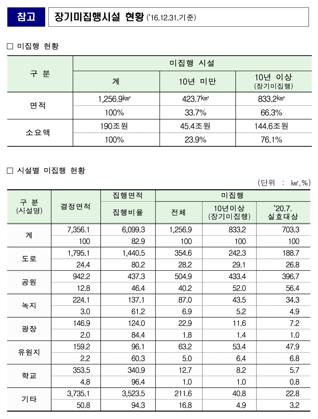 장기미집행시설은 ’16년말 기준으로 총 833㎢ (약7만여 건, 서울 1.38배)로서 집행 시 총 145조 원 (보상비 63조 원, 공사비 82조 원)이 소요될 것으로 추정하고 있다.(2016년 도시계획현황)