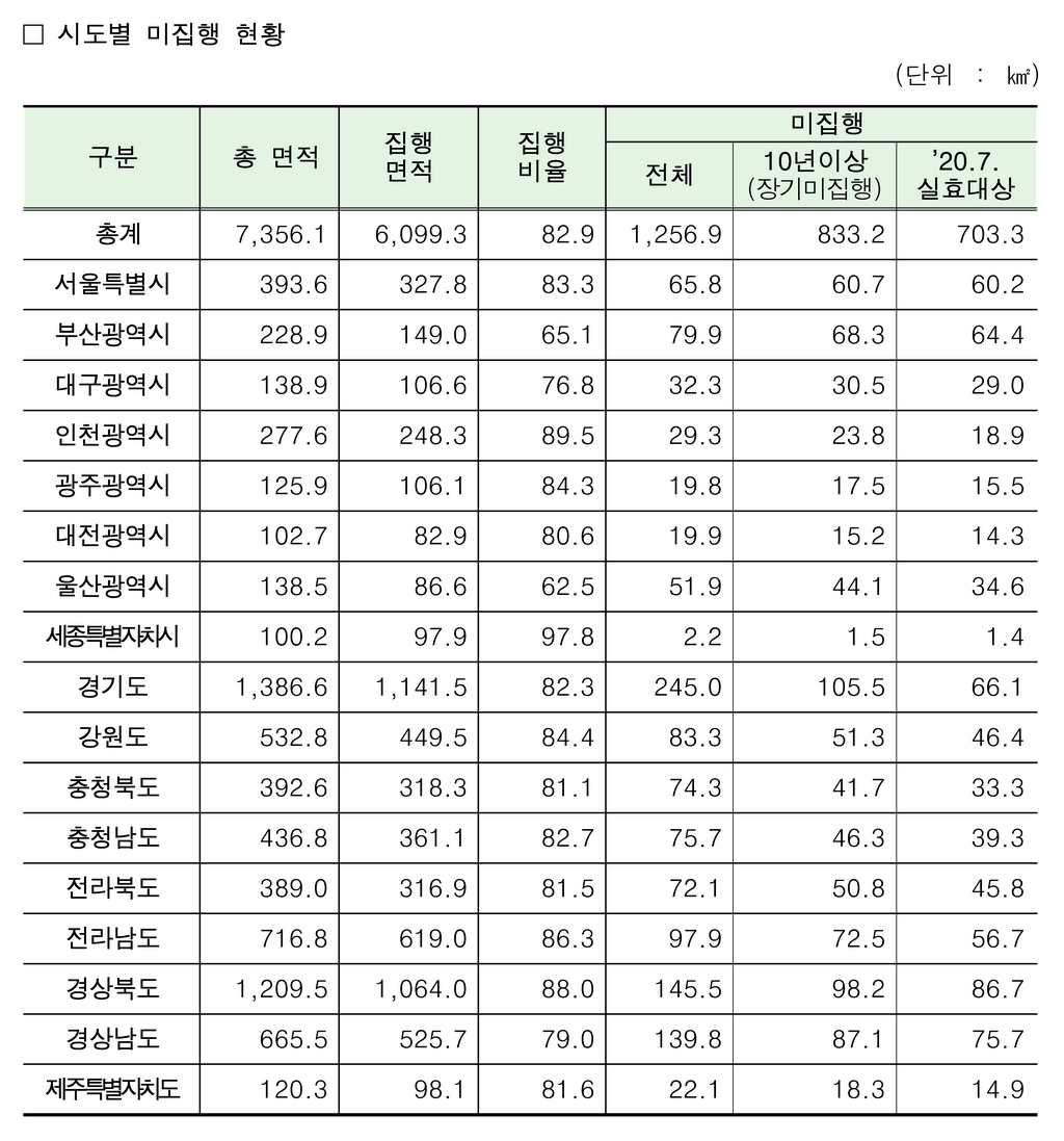 최근 3년간 장기미집행시설 현황은 ’2014년 943㎢, 2015년 869㎢, 20’16년 833㎢로 감소하고 있으나 이중 20년 이상 미집행시설 약 703㎢는 실효제에 따라 2020년 7월부터 효력이 상실되는 점을 감안하여 연착륙을 위한 지속적인 노력과 관심이 필요한 상황이다.