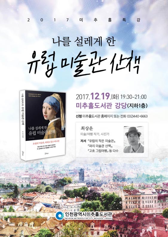 인천광역시(시장 유정복) 미추홀도서관은 최상운 작가 강연회 ‘나를 설레게 한 유럽 미술관 산책’을 오는 12월 19일에 진행한다고 밝혔다.