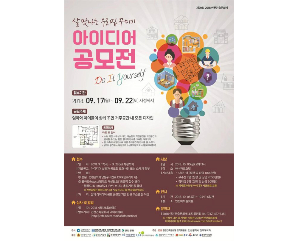 9월 17일(월) ~ 22일(금)까지 인천거주여성이며 누구나 참여할 수 있으며, A4 용지 1장 분량으로 모형사진이나 평면도나 배치도 등 스케치 그림 또는 아이디어를 글로만 적어서 제출해도 된다. 아이디어는 거주하면서 느꼈던 불편사항을 개선하거나, 내가 짓고 싶은 우리 집, 쓸모 없는 공간을 활용하는 나만의 방법 등 건축에 관한 어떠한 아이디어라도 접수 가능하다. 접수는 대한건축사협회 인천광역시 건축사회(남동구 석산로 159 보인프라자 7층 032-437-3381)에서 방문접수 중이다. 대상1명(상금 100만원)과 우수상2명, 장려상5명 등 총상금 350만원에 8명을 선정하는 이번 공모전 시상 또한 개막식에서 진행될 예정이다.