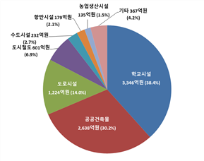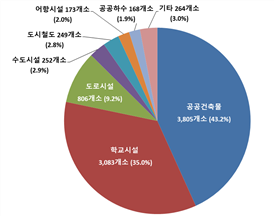 시설물별 현황은 공공건축물(3,805건), 학교시설(3,083건), 도로시설(806건) 순으로 내진 성능을 확보하였고, 학교시설(3,346억), 공공건축물(2,638억), 도로시설(1,224억) 순으로 예산이 투자되었다.