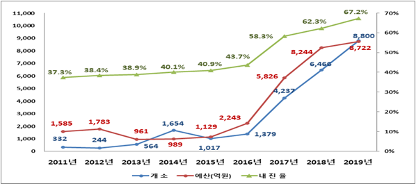 포항지진 이후 지난 5년(2011~2016년) 평균과 비교하여 예산투자가 2017년 4.02배, 2018년 5.69배, 2019년 6.02배로 크게 증가하였고 이를 통한 내진 성능 확보 건수가 늘어나 내진율이 급격히 높아진 것으로 보인다.