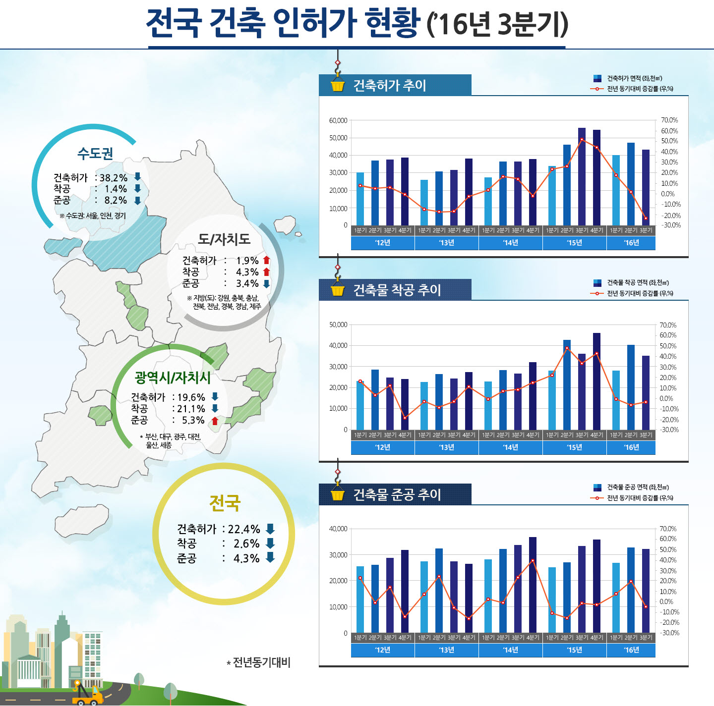 국토교통부(장관 강호인)는 2016년 3분기 건축 인허가 면적은 전년 동기 보다 22.4% 감소한 43,230천㎡, 동수는 0.4% 감소한 69,874동이라고 밝혔다.