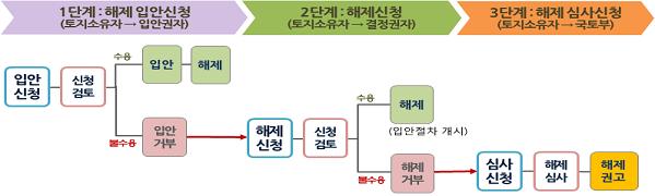 ㅇ (2단계) 토지소유자는 1단계 신청에도 불구하고, 해제 입안이 되지 않는 등의 사유가 발생하면 추가적으로 결정권자(광역자치단체 또는 기초자치단체장)에게 해제신청을 할 수 있다.