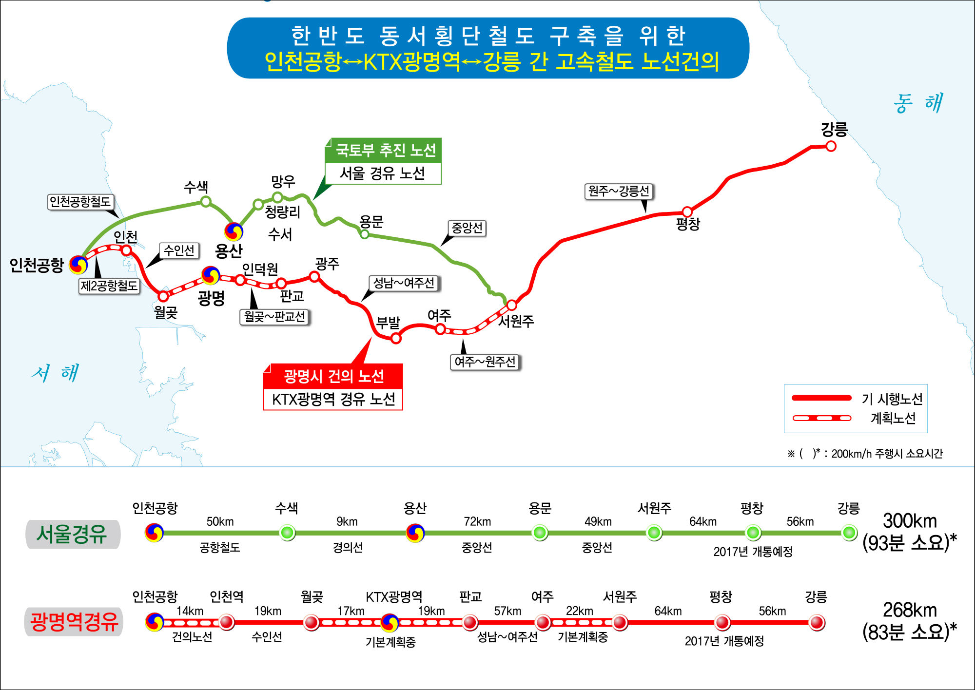광명시는 정부가 내년 2월 평창올림픽을 위해 결정한 철도노선(인천공항-서울역-청량리역-평창- 강릉)은 대회 선수단과 관광객 등을 염두에 둔 것으로 동서횡단철도 기능으로는 한계가 있다고 지적했다.